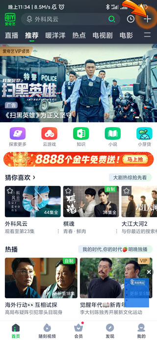 1、爱奇艺会员扫码登陆首先需要打开爱奇艺APP,点击页面右上角的“加号”图标。